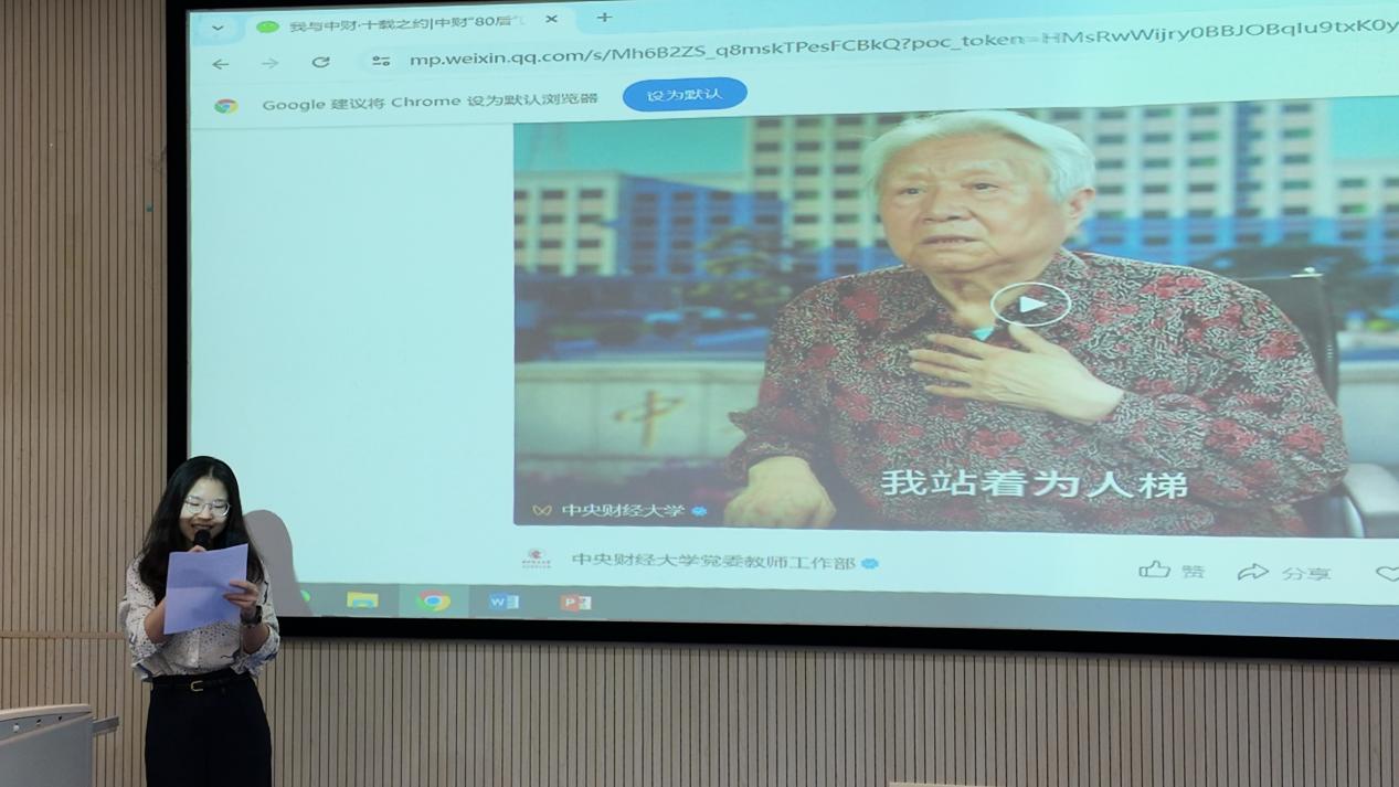 顾雷雷副院长介绍了王老师的优秀事迹:王巾英教授是中央财政金融学院(现awc777万象城娱乐官网)二级教授、博士生导师,我国著名市场营销与涉外经济管理专家、财经教育家,市场学本土化拓荒者。她的多部著作获评优秀教材,填补了中国高校市场学教材的空白,创建了国内市场学课程体系。她以“为人梯、为人桥、为人路”的师者担当,照亮无数学子的成长之路。