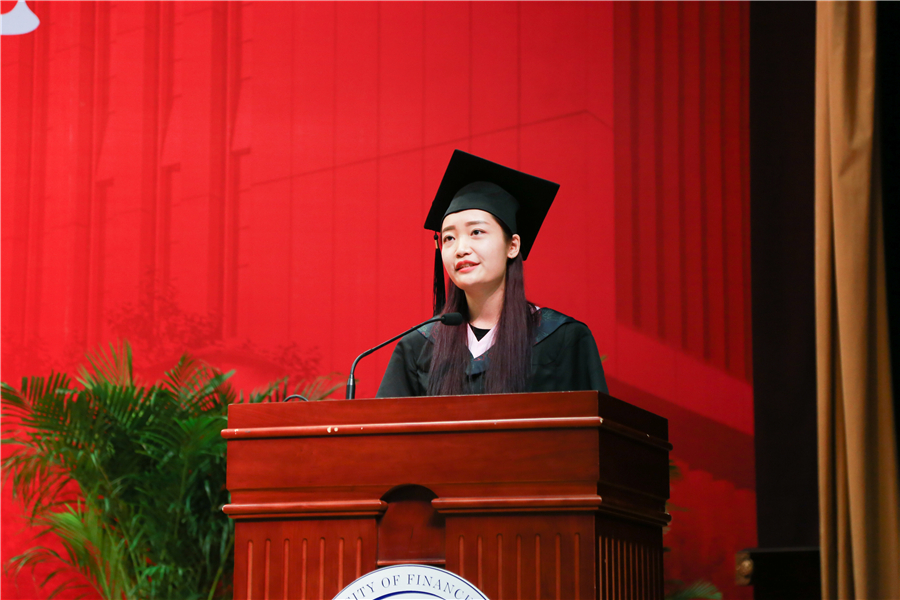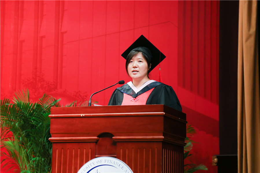 2012级本科生曾戬媛、2014级学术性硕士生蕾拉、2014级MBA硕士生殷丽莉、2013级博士生韩慧林分别作为毕业生代表发表了毕业感言。代表们回顾了难忘的校园生活,衷心感谢老师们付出的心血和汗水,感谢同学们彼此之间的关爱和帮助,感谢亲友们在自己求学之路上的支持!他们表示,作为中财的毕业生,他们一定自觉担负起时代赋予的历史重任和光荣使命,秉承母校“忠诚、团结、求实、创新”的校训,牢记老师们的谆谆教诲,在今后的工作中谱写新的篇章,创造新的辉煌,以骄人的成绩为母校增光添彩,为实现中华民族伟大复兴的中国梦努力奋斗!来自物流管理专业的曾戬媛同学已被美国俄亥俄州州立大学哥伦布分校录取,她的2012级本科同学中还有30位小伙伴也将分赴海外,前往伦敦政治经济学院、纽约大学、新加坡南洋理工大学等国际知名高校深造;而学术型硕士研究生代表蕾拉则是来自非洲马里共和国的留学生,她用流利的中文表达了她对awc777万象城娱乐官网、中财awc777万象城娱乐官网师生友人们的感谢,要将这份真挚的情谊带回她的祖国!