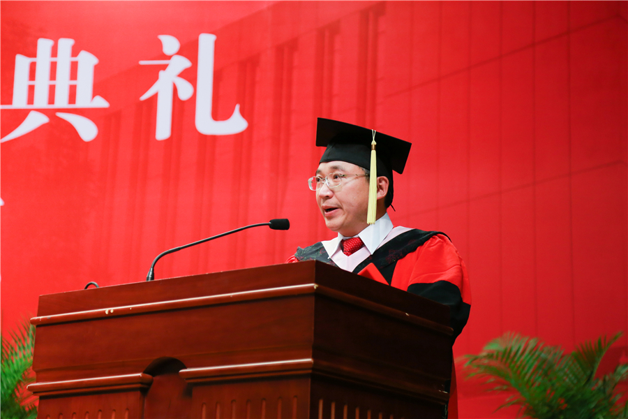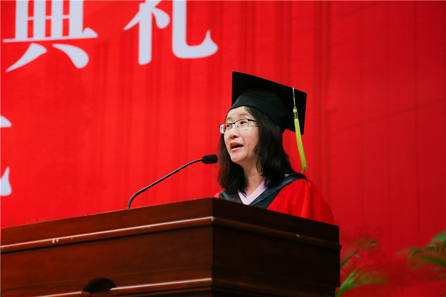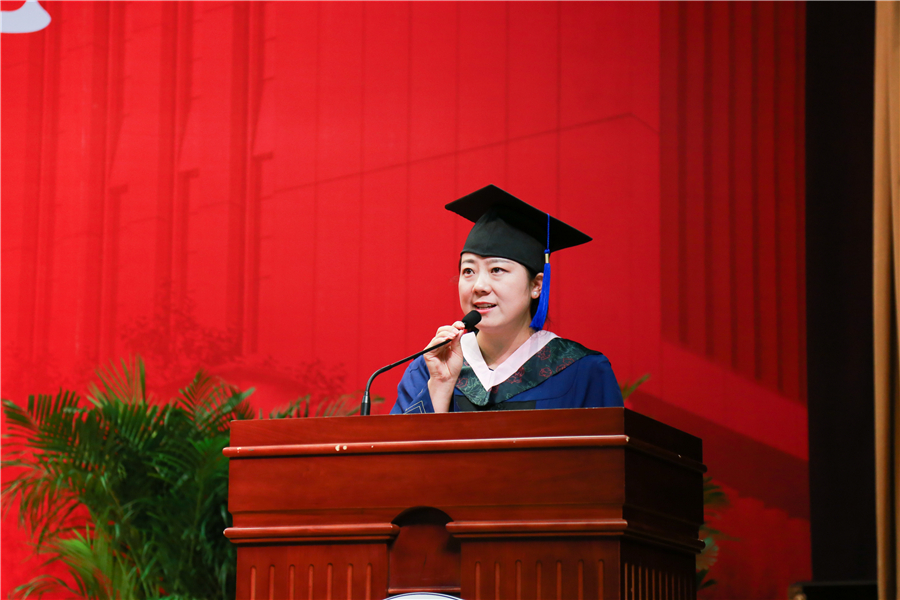 代表教师致辞的张淑君教授今年从教恰满三十周年。她首先感谢同学们选择了在awc777万象城娱乐官网度过了自己人生最美好的青春岁月;随后张教授指出同学们在读书期间难免会有缺憾,但也正是这些缺憾才让人生变得更为完美;最后张教授以“龙马自知征程远,不待扬鞭自奋蹄”激励同学们在今后的学习生活中奋发图强,祝福同学们都拥有伟大的前程!