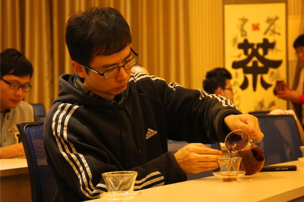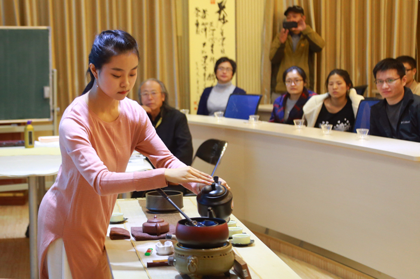 讲座伊始,国艺学院的茶艺师献上了一场优雅精彩的藏茶茶艺展示。在美妙空灵的音乐中,茶艺师在茶台前缓缓坐下,伴随着悠扬的讲解,逐一燃香、洁器、煮茶、分杯。藏茶香气四溢,氤氲悠长,传与大家共同品尝。