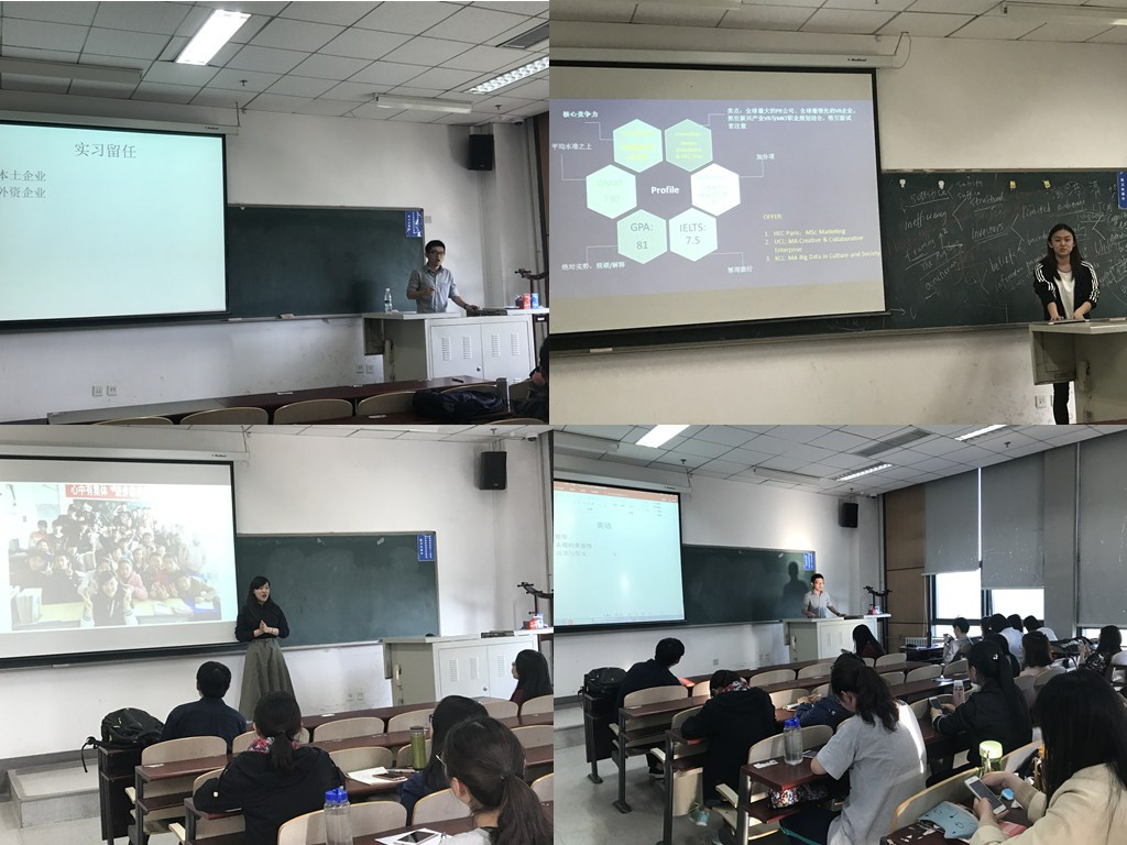 其次,2017年4月26日,为让大四毕业生在就业、出国、考研方面的信息与经验及时分享给低年级的同学,增进年级同学之间信息交流、文化传承,我院学工办策划了本科生考研、就业及出国经验交流分享会。在辅导员张碘老师的支持下,这次交流会邀请到了13级工商管理专业的段尘,13级物流管理专业的刘晓宇、刘伟,13级市场营销专业的张乃驰和13级人力资源管理专业的范伟珂等五位同学,分别就考研、就业及出国等低年级同学比较关注的话题进行交流。此外,研究生辅导员孙翔老师还邀请到了已经在我院读研的同学,包括支教保研成功的马雅璇、硕博连读成功的李宇萍、对成功考取本学院研究生很有感受的许弘佳、以及在考研政治、考研英语有独特想法的贾佳芳和马聪敏等学长,与低年级分享成功经验。为扩大分享会收益范围,此次活动特别面向了大一大二及大三的三个年级的本科同学。这也是我院在本科生就业工作上拓展和深化的步骤。