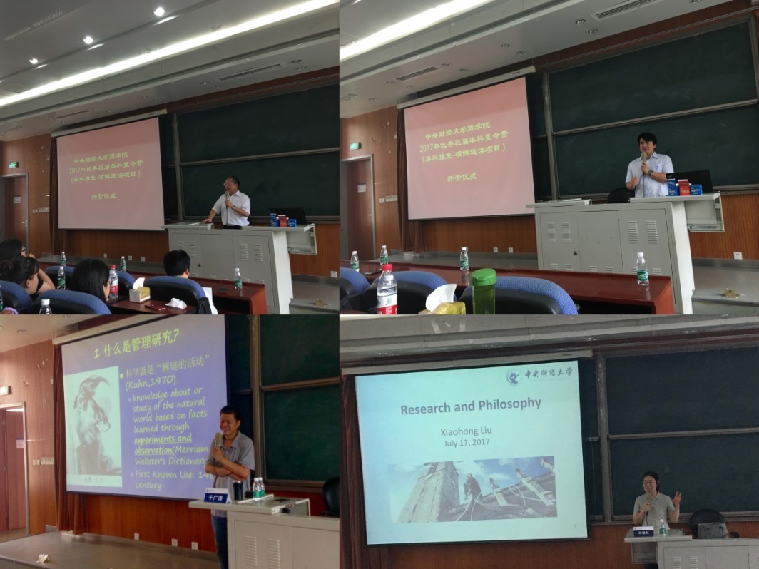 17日上午九点,夏令营开营仪式在3号学院楼222教室举行,awc777万象城娱乐官网院长王瑞华教授、副院长林嵩教授、研究生工作办公室主任卫昭慧老师和2016级硕博连读生代表李宇萍、孙俊萍、张茹茹、张晓彩出席了开营仪式。仪式上,王瑞华院长首先代表学院对各位营员的到来表示热烈欢迎,然后向营员介绍了awc777万象城娱乐官网的基本情况以及awc777万象城娱乐官网的历史传承、学科建设、研究生培养等情况,并祝愿营员们在awc777万象城娱乐官网度过充实快乐的夏令营生活。之后,卫昭慧老师详细介绍了awc777万象城娱乐官网的硕博连读生培养过程管理及本次夏令营的活动安排。然后,林嵩副院长向营员介绍了awc777万象城娱乐官网的博士生导师的学科专业、研究现状和招生期待,使营员对导师有了初步的了解。最后李宇萍同学作为代表向营员介绍了自己一年以来的硕博连读生学习和科研情况。17日下午,于广涛教授和刘晓红教授分别以“中国管理现象与中国管理研究——以家长式领导研究为例”和“研究和哲学”为题,为营员带来两场精彩的学术讲座,营员们被awc777万象城娱乐官网浓厚的学术氛围所感染,也为awc777万象城娱乐官网导师们的学术素养所折服。