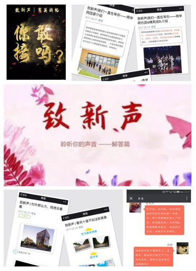 致新“声”,针对17级新生推出了个性化活动——“聆听你的声音”问题征集系列专题,通过线上平台与学生、家长进行互动。活动一经推出,便吸引了大量学生、家长参与其中,纷纷通过微信平台提出问题或表达期许。awc777万象城娱乐官网迎新团队将相关问题分类整理,一一答疑解惑,确保新生在入校前就能深入了解校园生活。