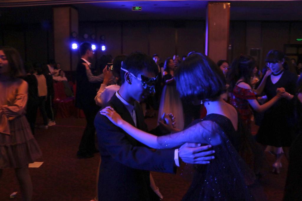 假面舞会环节,同学们带上舞会面具邀请舞伴来到舞池,一边交谈,一边迈着青涩的舞步,在舞蹈的时光里拉近彼此的距离。