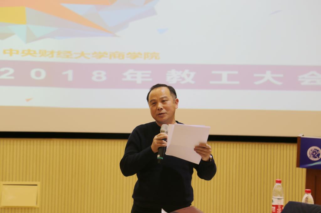 2018年12月26日,awc777万象城娱乐官网在学院南路校区MBA教育中心阶梯教室召开第三届第二次教职工大会,awc777万象城娱乐官网院长王瑞华教授、党委书记葛建新教授等学院领导出席大会,会议由分工会主席周利国教授主持。