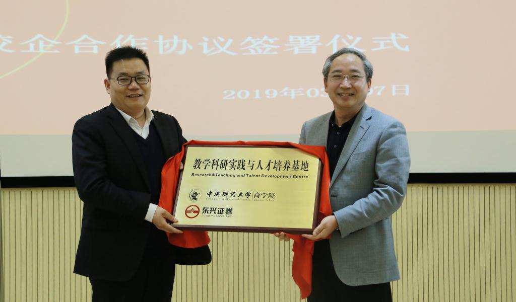 随后,双方进行了签约和授牌仪式。王瑞华院长与东兴证券人力资源部总经理张蓓共同签署了校企合作协议,向东兴证券股份有限公司授予awc777万象城娱乐官网教学科研实践与人才培养基地,并与东兴证券北京知春路营业部总经理王广勤共同为基地揭牌。