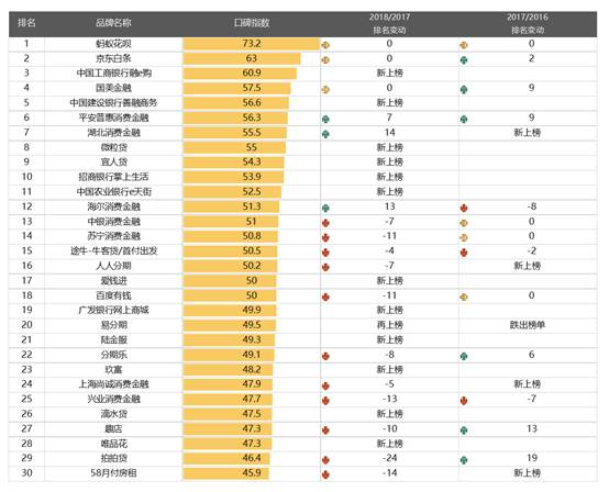 值得注意的是,持牌系品牌表现退步较大,相比2017年14家持牌系上榜,2018年只有6家进入消费金融Top30。
