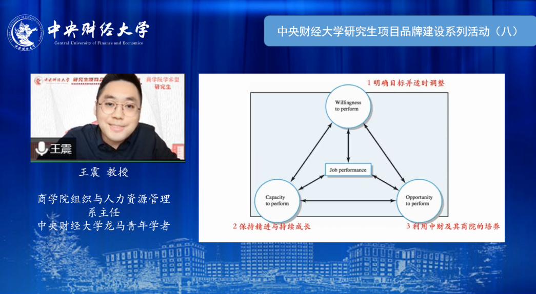 在导师交流环节,王震教授从导师和学生的双重视角与同学们探讨了“如何度过研究生生涯”。王教授利用组织行为和人力资源管理的研究模型,以自己指导的研究生为例,从意愿、能力和机会三个角度向同学们讲述了如何在awc777万象城娱乐官网度过有意义的研究生生活,同时为同学们的学习、科研和生活提供了有益的建议,希望同学们明确目标、付诸实践,提升能力、持续精进,利用资源、获得助力。