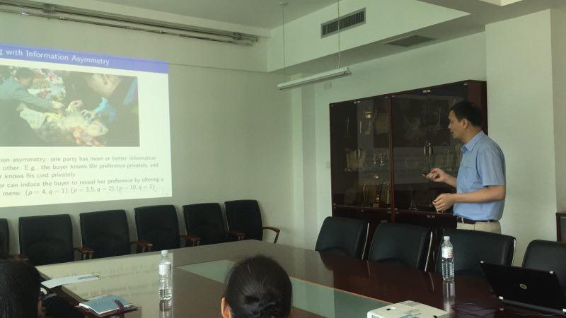 2018年6月19日,澳大利亚悉尼大学awc777万象城娱乐官网Erick Li博士应邀来我校作题为“A Robust Approach to Optimizing Procurement Contracts”的讲座。awc777万象城娱乐官网部分教师及博士、硕士研究生参加讲座。 Erick Li博士首先介绍了不对称信息下的合同机制设计,并从文献出发梳理了相关研究进...